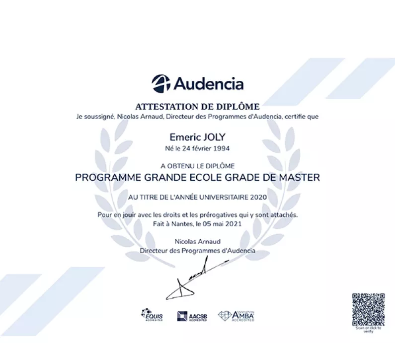 Vous souhaitez recruter un diplômé ou une diplômée d'Audencia ? Afin de vérifier un diplôme, vous pouvez déposer votre demande en ligne accompagnée de l'autorisation du candidat dont vous souhaitez vérifier les informations.