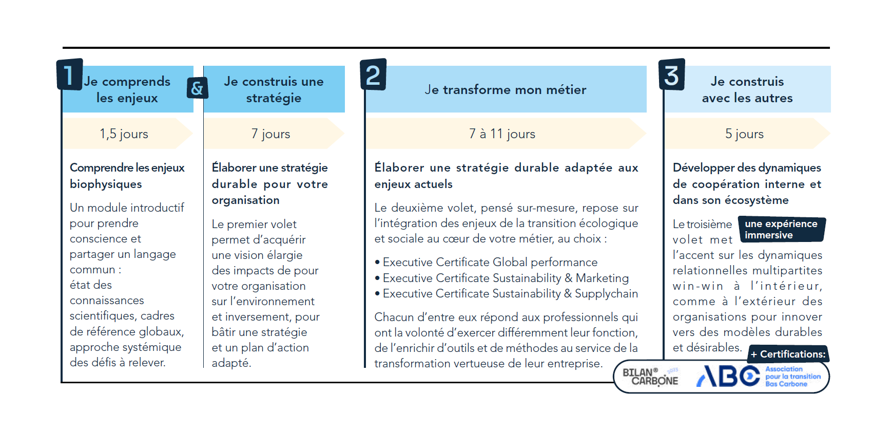 Ce programme en présentiel, compatible avec un emploi du temps professionnel, combine approches scientifiques, outils concrets et travail collectif, aboutissant à un hackathon final. Il vise à dépasser la sensibilisation pour ancrer des modèles d’affaires régénérateurs, en s’appuyant sur les neurosciences et les sciences comportementales.