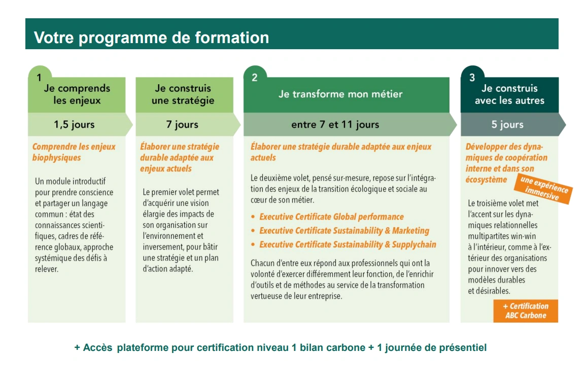 Ce programme en présentiel, compatible avec un emploi du temps professionnel, combine approches scientifiques, outils concrets et travail collectif, aboutissant à un hackathon final. Il vise à dépasser la sensibilisation pour ancrer des modèles d’affaires régénérateurs, en s’appuyant sur les neurosciences et les sciences comportementales.